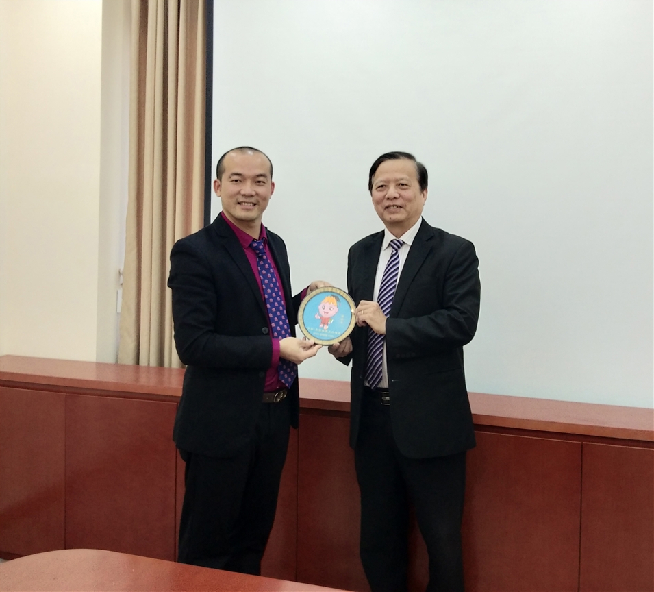 廣西金沛教育執(zhí)行董事粟宥朝(左一)拜訪越南工商總會副主席黃光防(右一)并贈送吉祥物“金小沛”