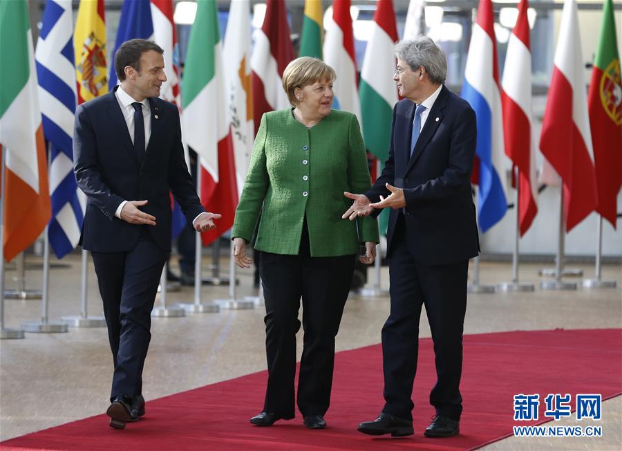 2月23日,在比利時首都布魯塞爾,法國總統(tǒng)馬克龍(左)、德國總理默克爾(中)和意大利總理真蒂洛尼抵達峰會會場。