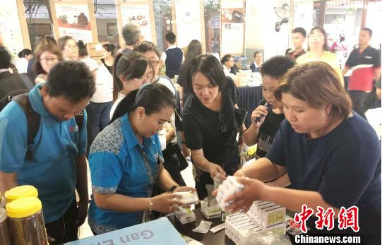 ▲圖為由中國知名中成藥企業(yè)主辦的一場活動中,印尼民眾爭相購買太極藿香正汽口服液。鐘欣 攝