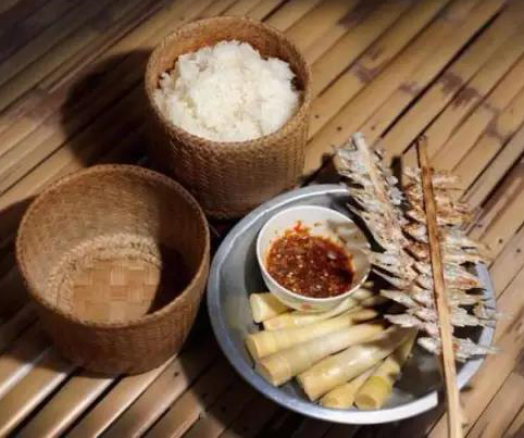 老撾人將洗凈、浸泡過的大米、糯米或紫米加些魚肉,有時加入椰子汁或椰蓉,混合后裝入竹筒內,并用芭蕉葉封口,放在炭火上以小火烘烤至竹筒焦黑,飯便熟了。