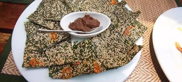 老撾是東南亞唯一的內陸國,海產品相對周邊鄰國少了很多,可是流經老撾的湄公河盛產河苔,是一道著名的下酒菜。這道菜的老撾名叫Khai Paen,將河苔片下油鍋炸至酥脆后撒上芝麻,搭配檸檬草、花生、蘸醬等一起吃,味道極其鮮美。