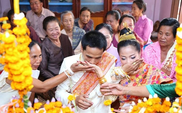 感恩儀式是婚禮上一項(xiàng)重要程序,過(guò)程也非常復(fù)雜,新郎新娘要感謝雙方父母養(yǎng)育之恩,雙方家長(zhǎng)要宣講老撾的“十二風(fēng)”、“十四俗”,強(qiáng)調(diào)夫妻互敬之德,提醒雙方尊敬老人。