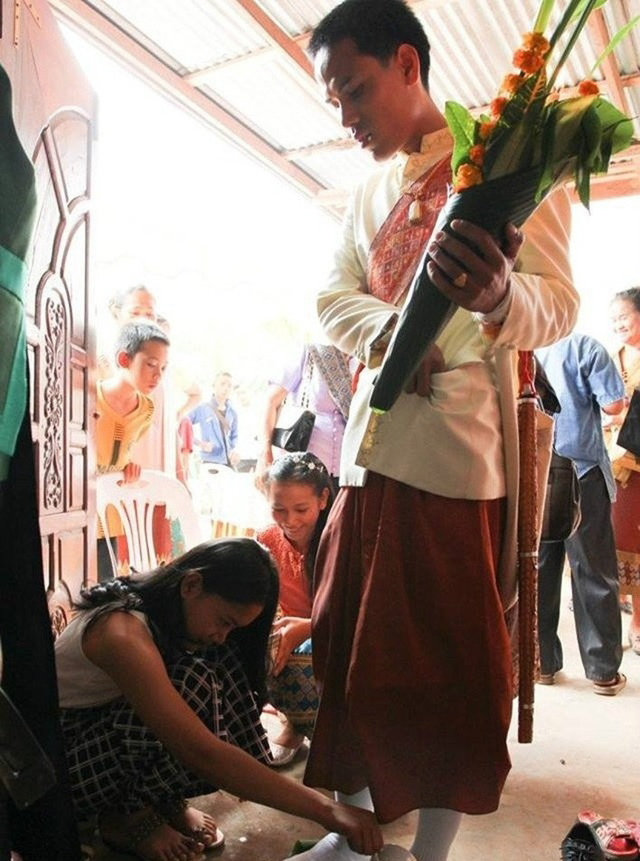 老撾婚禮中有一個(gè)很重要的儀式,老撾語(yǔ)稱“女婿游行”。即婚禮當(dāng)天,新郎按傳統(tǒng)風(fēng)格打扮,穿兜襠褲,配寶劍,手拿甘蔗和鮮花(象征保衛(wèi)愛(ài)情和創(chuàng)造甜蜜美好的新生活)前往新娘家。在距離新娘家還有一段距離時(shí),所有人必須下車,步行向新娘家走去。為體現(xiàn)男方家的誠(chéng)意和身份,迎親隊(duì)伍會(huì)制造隆重?zé)崃业膱?chǎng)面和氣氛,一路敲鑼打鼓,鳴放鞭炮,載歌載舞。
