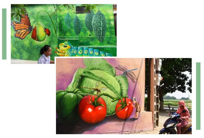 褚舍村以安全蔬菜種植業(yè)聞名,因此15幅大型壁畫重現(xiàn)了當(dāng)?shù)剞r(nóng)民的日常生活畫面,從各種農(nóng)作物、蔬菜、果園,壁畫中一個(gè)純農(nóng)業(yè)小村的畫面給參觀者帶來一種自然和美麗的視覺效果。