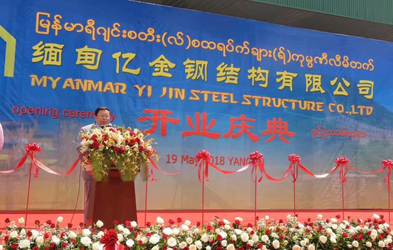 2018年仰光市,中國(guó)—東盟商務(wù)理事會(huì)執(zhí)行理事長(zhǎng)許寧寧應(yīng)邀在緬甸億金鋼結(jié)構(gòu)公司開業(yè)盛典上致辭:中緬企業(yè)增進(jìn)合作、共同發(fā)展。該公司是中緬合資,是緬甸最大的鋼結(jié)構(gòu)加工和安裝企業(yè),承建了包括緬甸國(guó)家體育館、曼德勒商務(wù)與會(huì)議中心等多個(gè)標(biāo)志性建筑。
