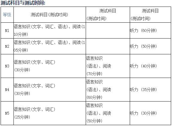 N3、N4、N5考試分"語言知識(shí)(文字、詞匯)";"語言知識(shí)(語法)、閱讀"及"聽力"3個(gè)科目,滿分均為180分。